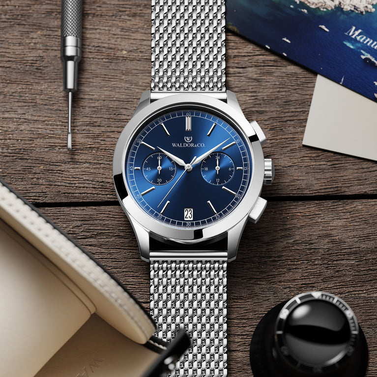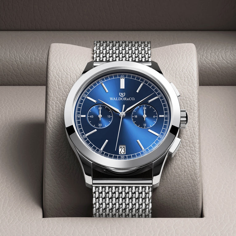 The striking blue dial of the Chrono 39 Sardinia is reminiscent of the crystal-clear waters of Sardinia, a nod to the exclusive and serene spirit of the Mediterranean. This particular blue is vibrant yet deep nuance, designed to catch and play with the light in a way that mimics the sun's reflections off the ocean's surface.