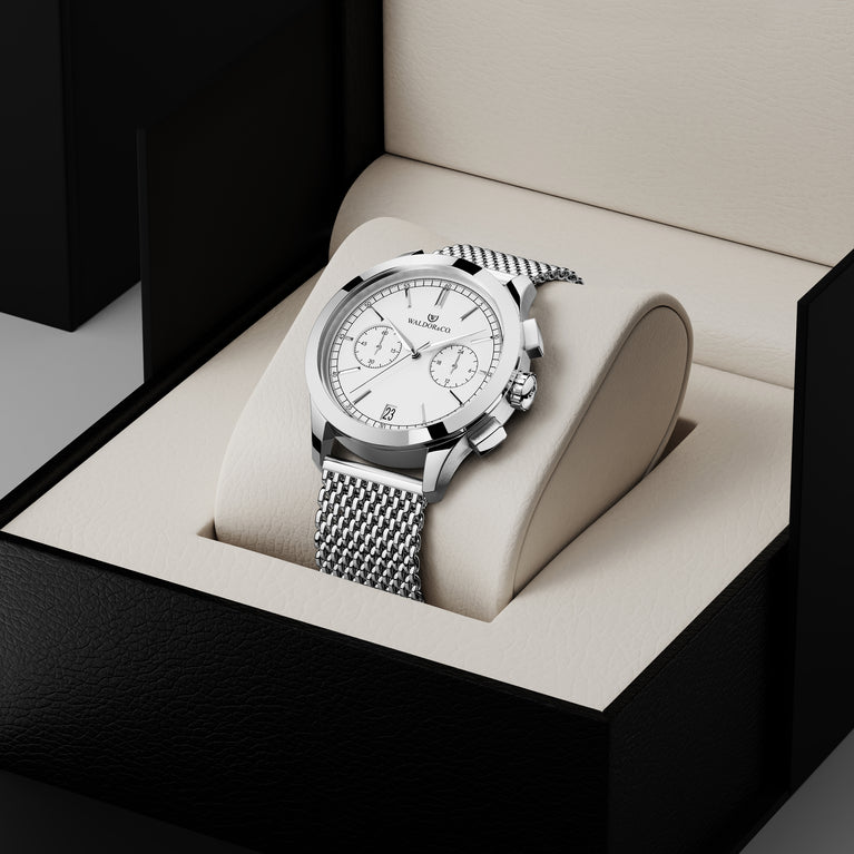 Strap: Mesh strap in rhodium-plated 316L stainless steel