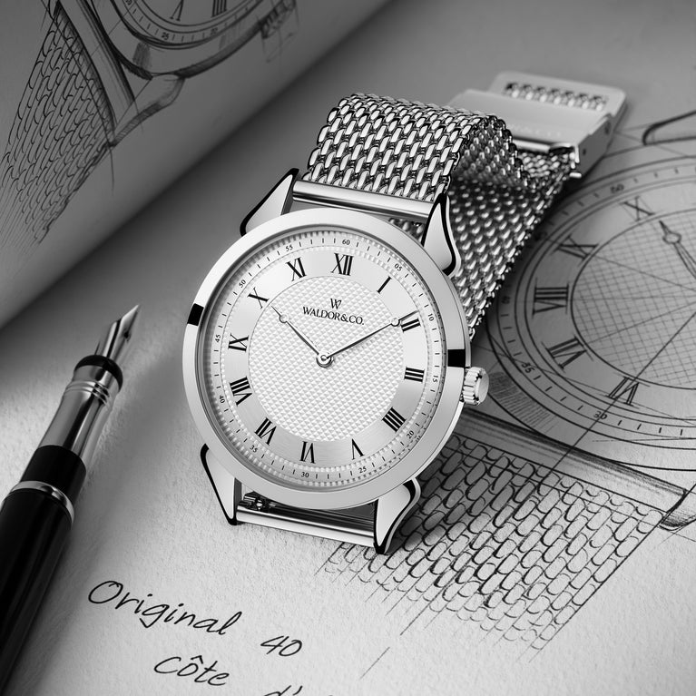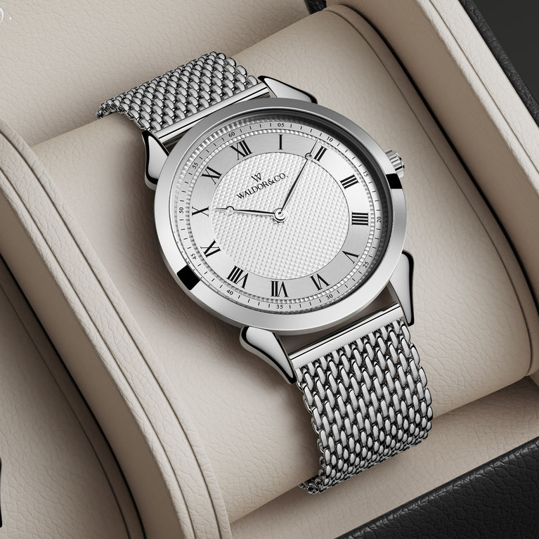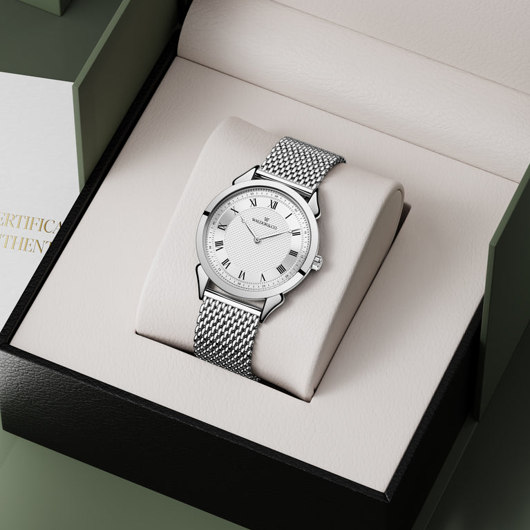 Strap: Mesh strap in rhodium-plated 316L stainless steel